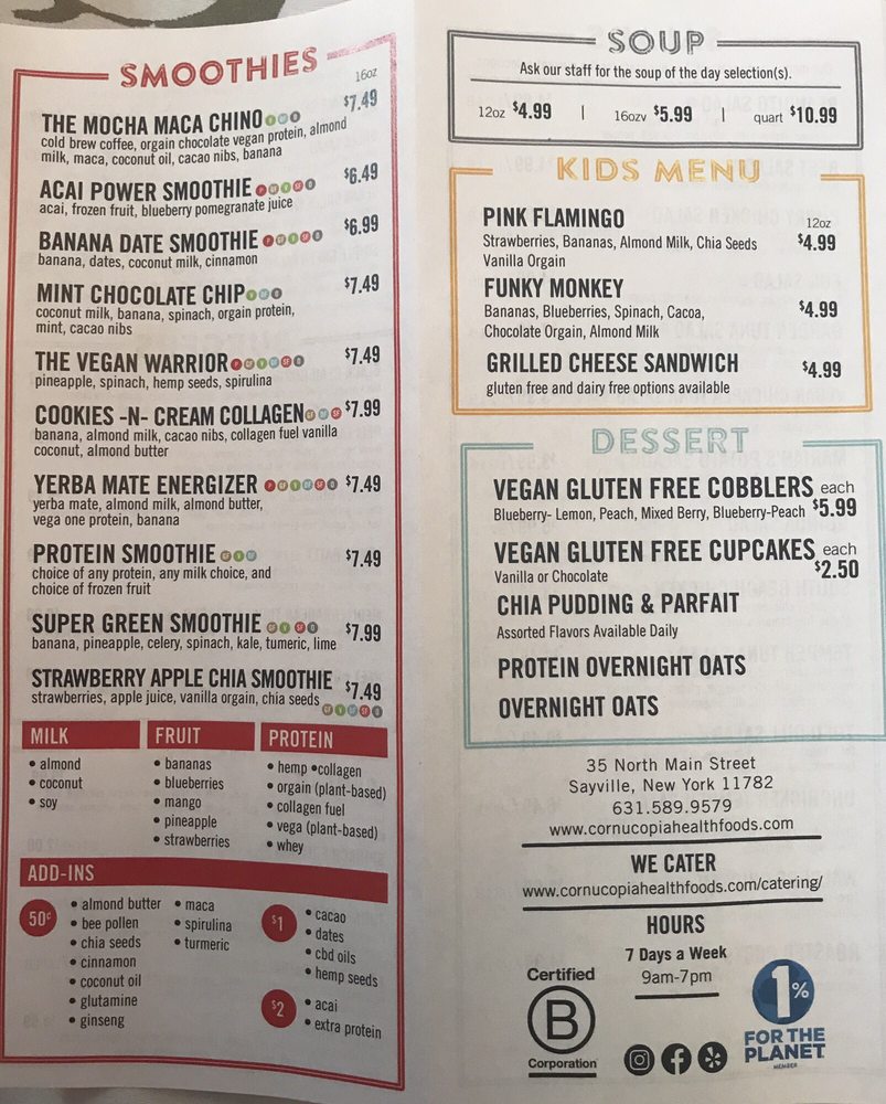 Introducing Cornucopia Natural Foods, a charming deli located at 35 N Main St in Sayville, NY. This eatery offers a variety of fresh and healthy options, with a focus on vegan cuisine. With amenities such as delivery services, outdoor seating, and catering, Cornucopia Natural Foods caters to a wide range of preferences and dietary needs. The menu boasts an array of flavorful dishes that are sure to satisfy even the most discerning palates. Whether you're looking for a quick bite to eat or a delicious meal to enjoy with friends, Cornucopia Natural Foods has something for everyone. Don't miss out on the opportunity to experience the culinary delights that this establishment has to offer.